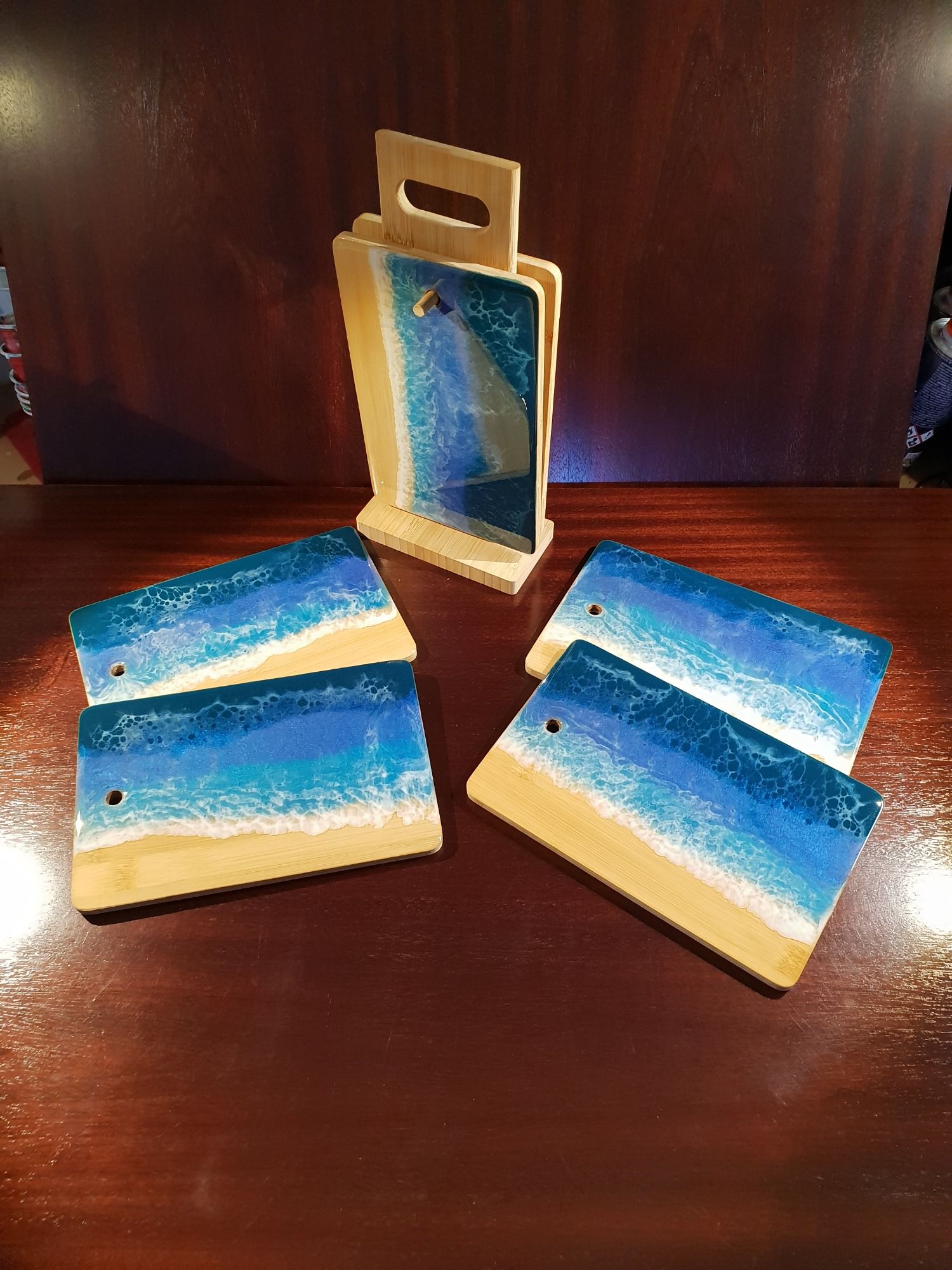 Bestehend aus 6 Bambus-Brettchen mit liebevollem Epoxidharzdesign, inkl. Ständer